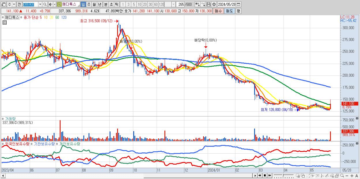 - 메디톡스 (141,100원 ▲ 8.79% , 시총: 10,298억, 외국인 순매수 거래금:58억)