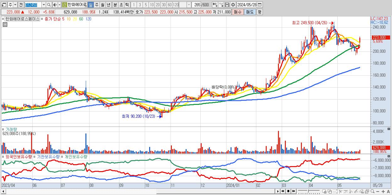 - 한화에어로스페이스 (223,000원 ▲ 5.69% , 시총: 112,905억, 외국인 순매수 거래금:162억)