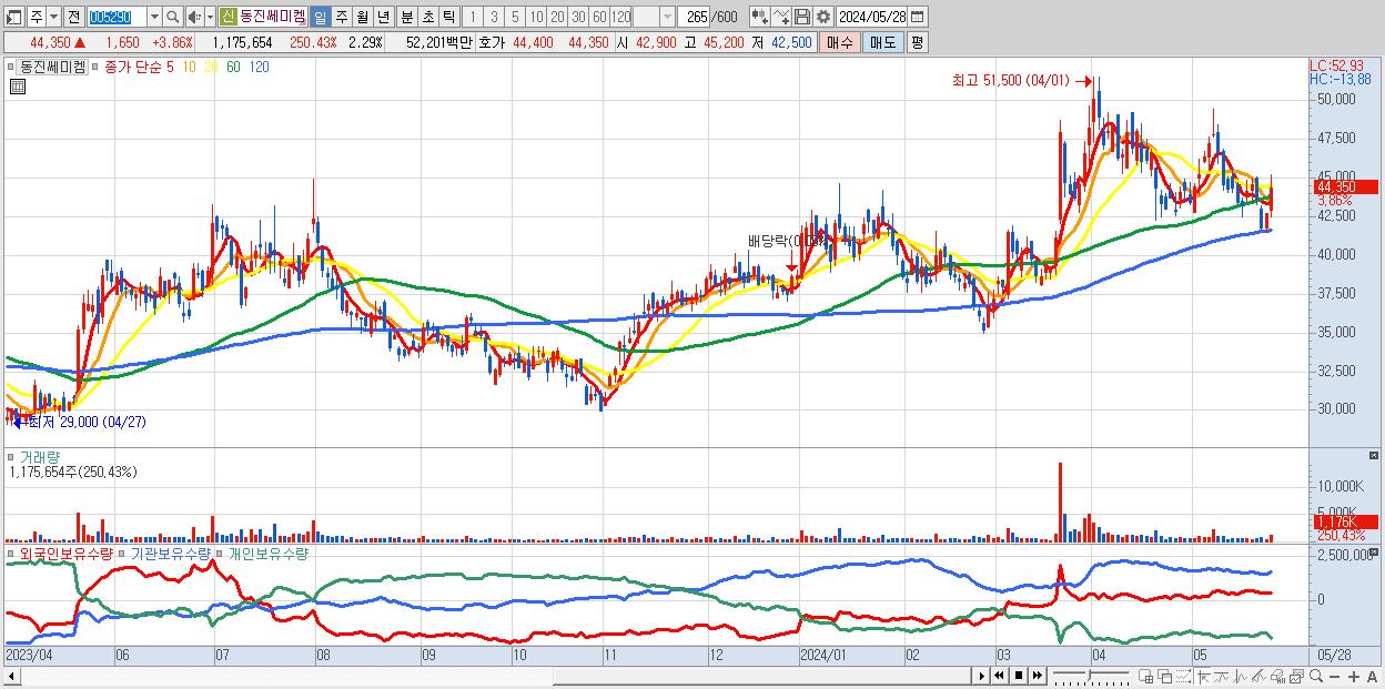 - 동진쎄미켐 (44,350원 ▲ 3.86% , 시총: 22,802억, 외국인 순매수 거래금:59억)