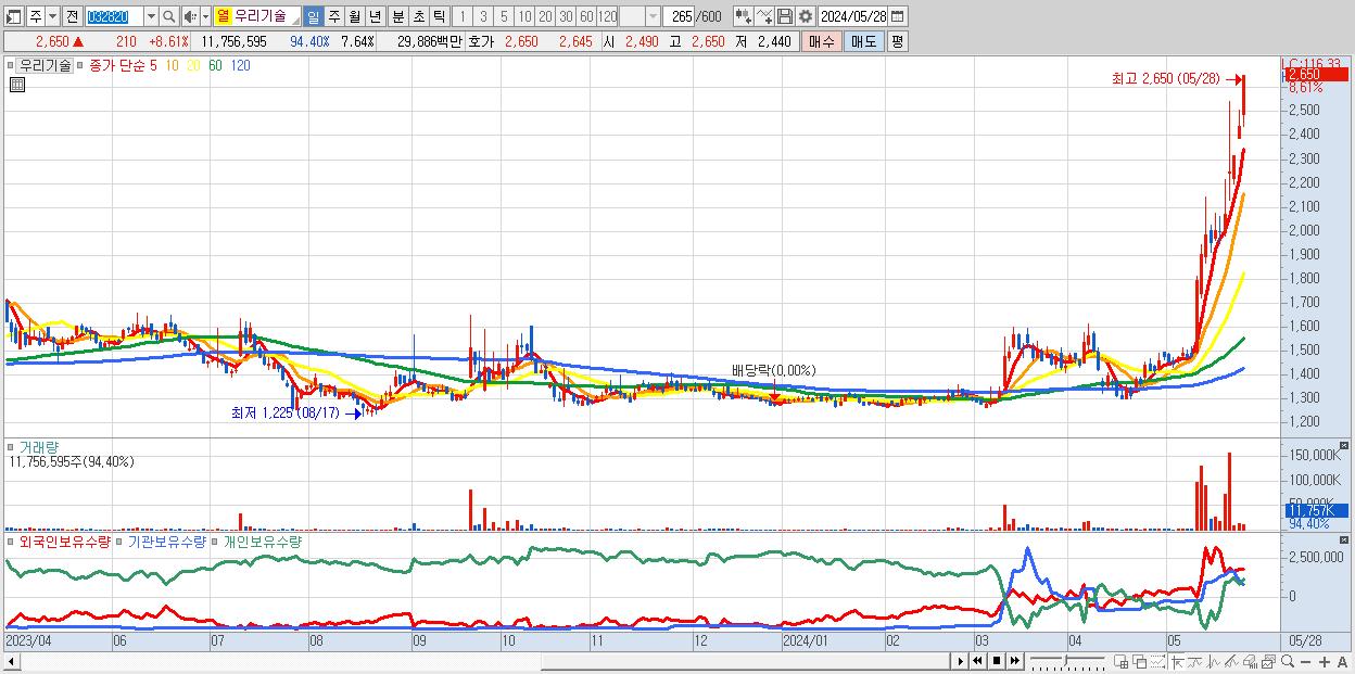 - 우리기술 (2,650원 ▲ 8.61% , 시총: 4,076억, 거래량: 11,756,595, 거래대금:299억, KOSDAQ)