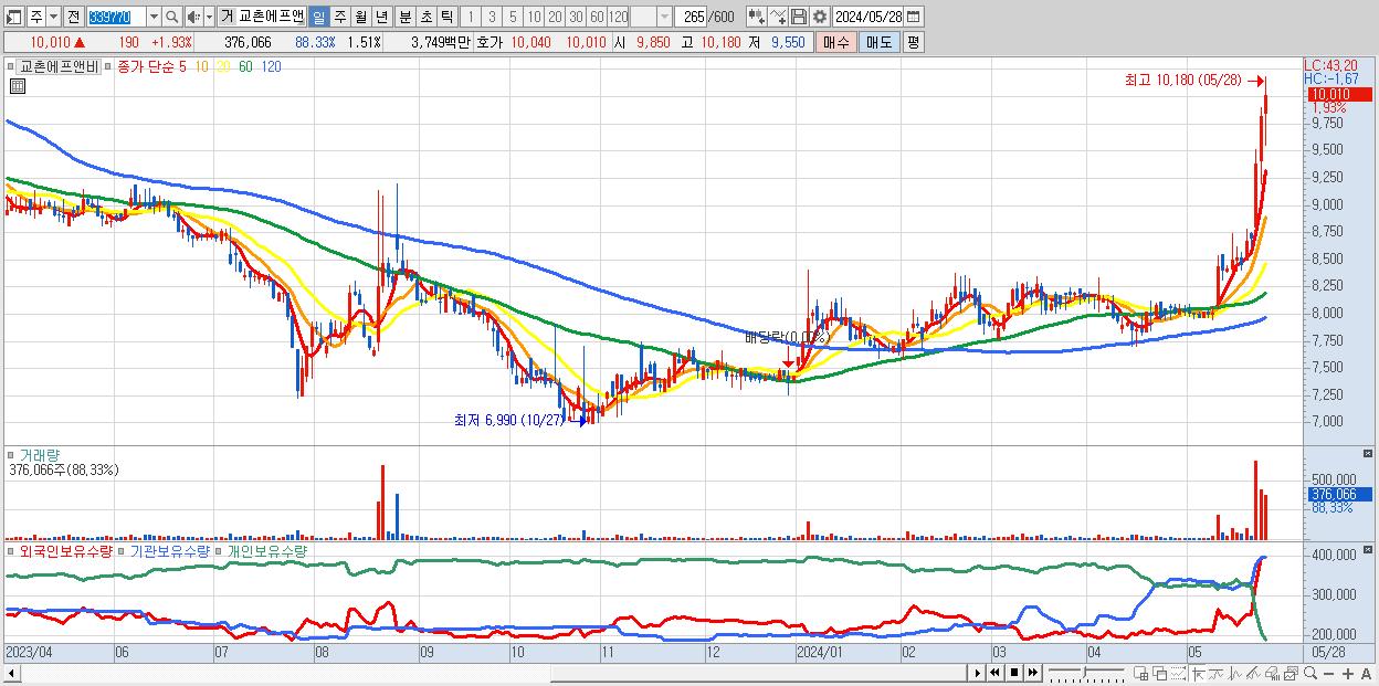 교촌에프앤비 10,010원 ▲ 1.93% (KOSPI, 339770)
