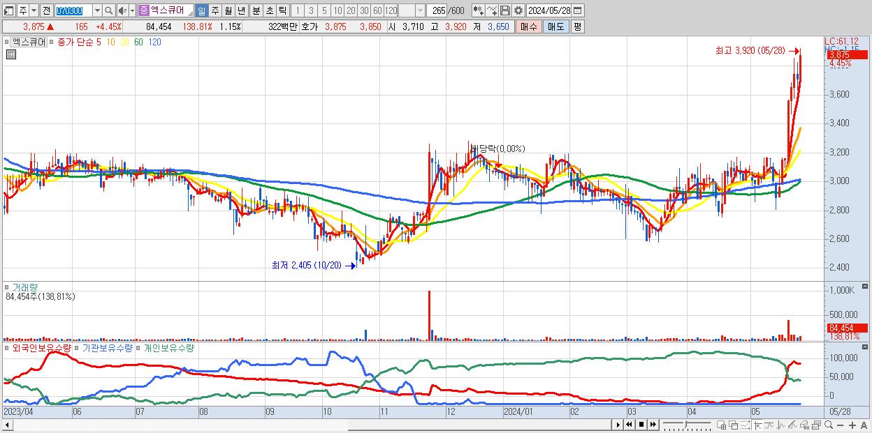 - 엑스큐어 (3,875원 ▲ 4.45% , 시총: 285억, 거래량: 84,454, 거래대금:3억, KOSDAQ)