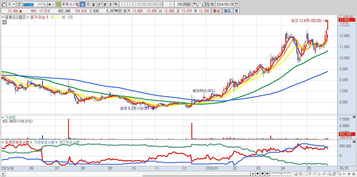 - 로체시스템즈 (13,460원 ▲ 7.51% , 시총: 2,059억, 거래량: 402,348, 거래대금:53억, KOSDAQ)