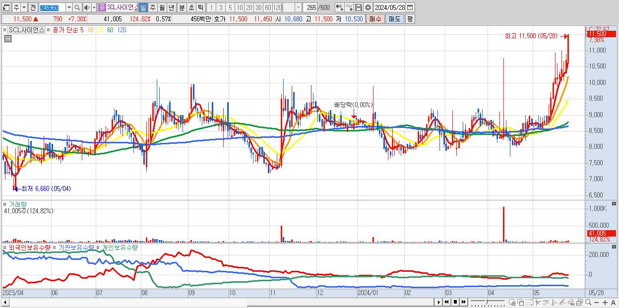 - SCL사이언스 (11,500원 ▲ 7.38% , 시총: 832억, 거래량: 41,005, 거래대금:5억, KOSDAQ)
