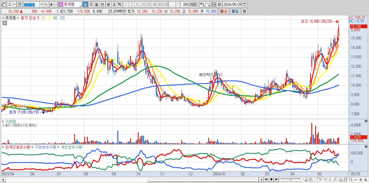 - 퓨쳐켐 (16,240원 ▲ 6.49% , 시총: 3,589억, 거래량: 1,421,739, 거래대금:231억, KOSDAQ)