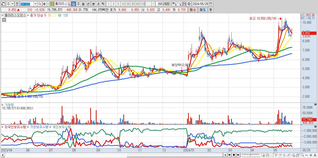 - 폴라리스오피스 (8,850원 ▲ 3.63% , 시총: 4,401억, 거래량: 15,795,571, 거래대금:1,441억)