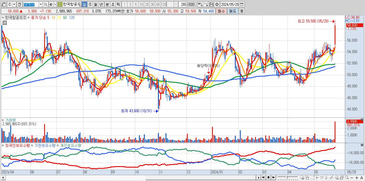 - 한국항공우주 (58,600원 ▲ 7.13% , 시총: 57,120억, 거래량: 2,989,965, 거래대금:1,734억)