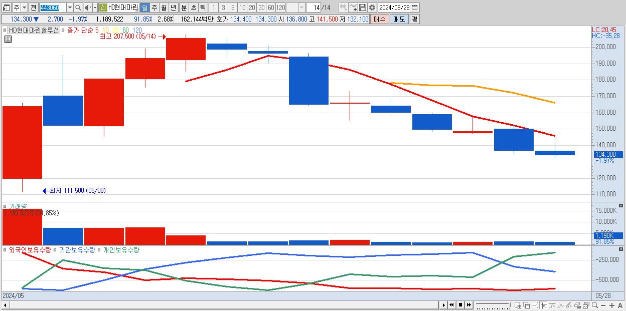 - HD현대마린솔루션 (134,300원 ▼ -1.97% , 시총: 59,696억, 거래량: 1,189,522, 거래대금:1,621억)