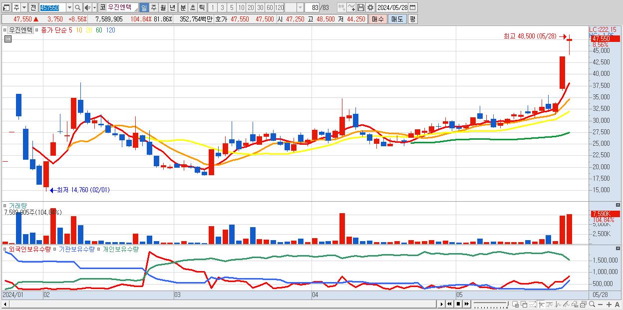 - 우진엔텍 (47,550원 ▲ 8.56% , 시총: 4,409억, 거래량: 7,589,905, 거래대금:3,528억)