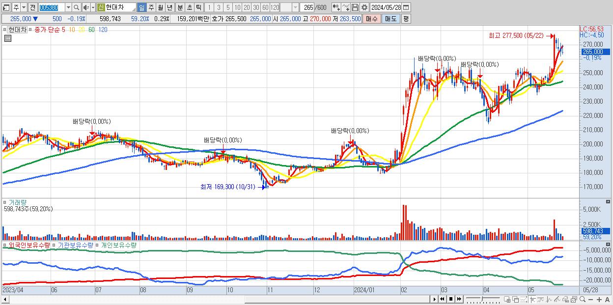 - 현대차 (265,000원 ▼ -0.19% , 시총: 554,953억, 거래량: 598,743, 거래대금:1,592억)
