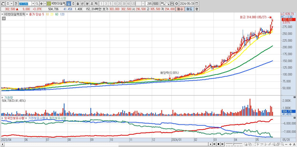 - HD현대일렉트릭 (302,500원 ▲ 3.07% , 시총: 109,043억, 거래량: 504,736, 거래대금:1,523억)