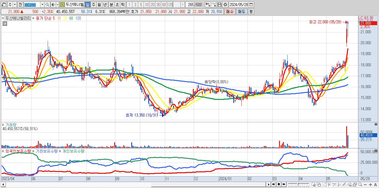 - 두산에너빌리티 (21,800원 ▲ 2.35% , 시총: 139,642억, 거래량: 40,450,557, 거래대금:8,684억)