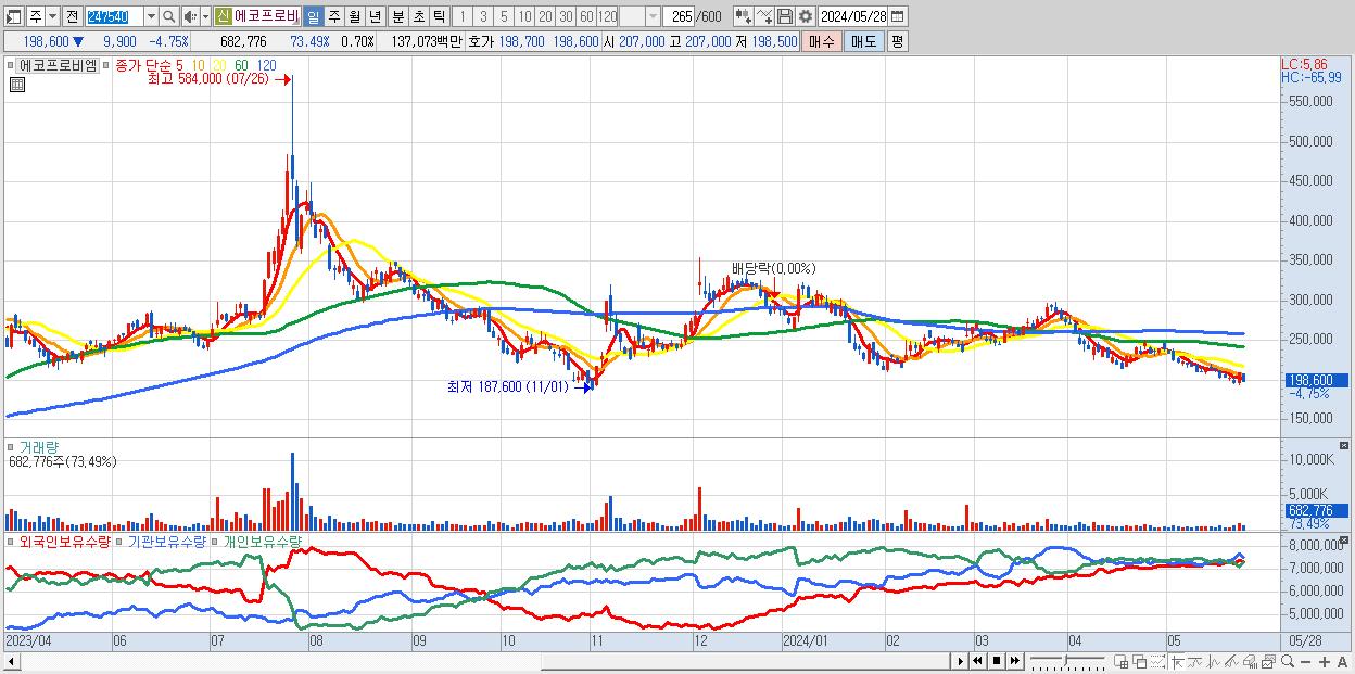 - 에코프로비엠 (198,600원 ▼ -4.75% , 시총: 194,233억, 거래량: 682,776, 거래대금:1,371억)