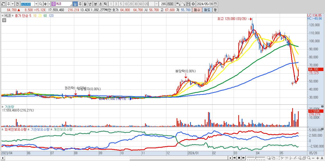 - HLB (64,700원 ▲ 15.12% , 시총: 84,657억, 거래량: 17,559,460, 거래대금:10,923억)