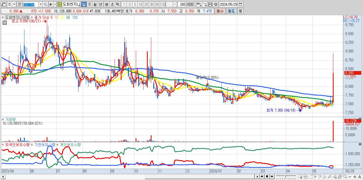 - 도화엔지니어링 (8,380원 ▲ 11.58% , 시총: 2,826억, 거래량: 16,128,880, 거래대금:1,365억)