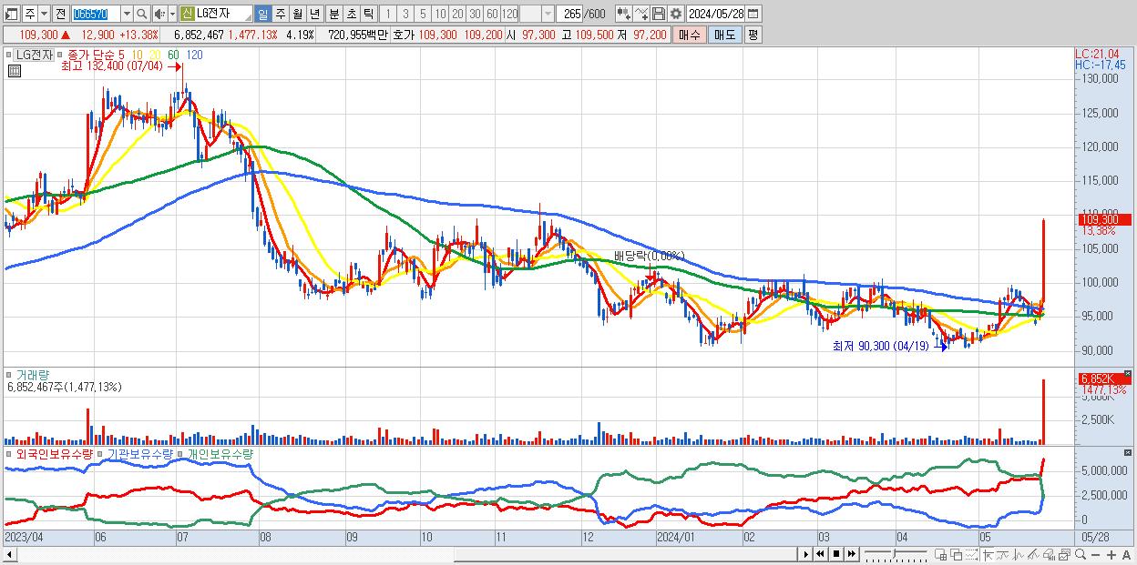 - LG전자 (109,300원 ▲ 13.38% , 시총: 178,867억, 거래량: 6,852,467, 거래대금:7,210억)