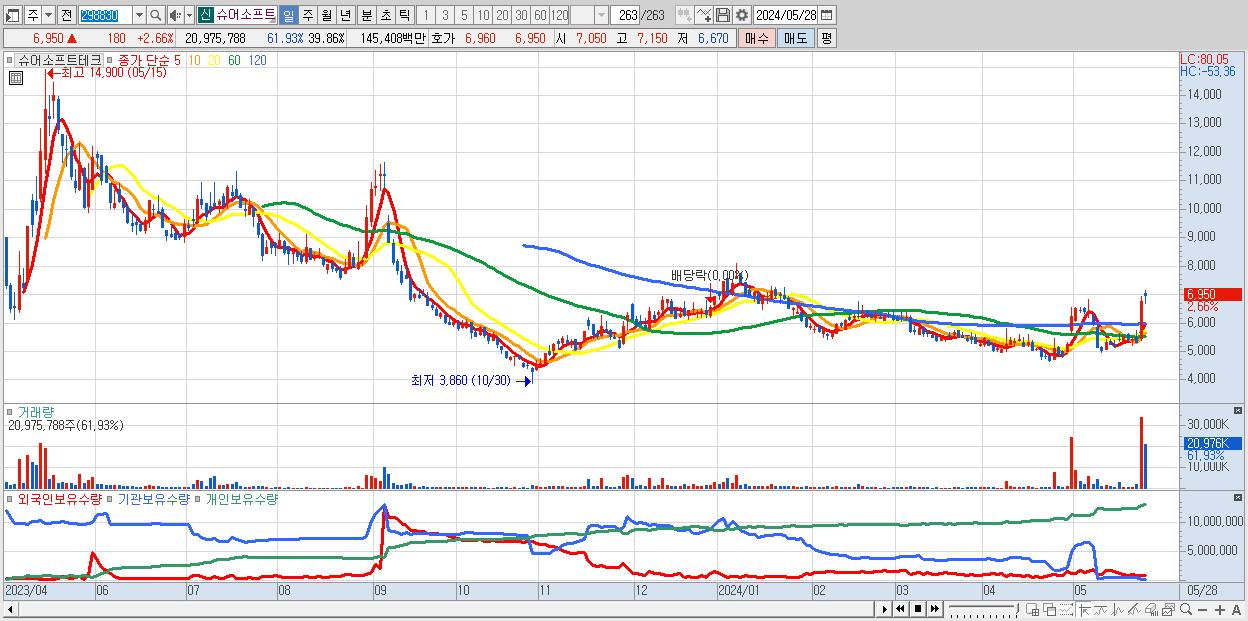 - 슈어소프트테크 (6,950원 ▲ 2.66% , 시총: 3,657억, 거래량: 20,975,788, 거래대금:1,454억)
