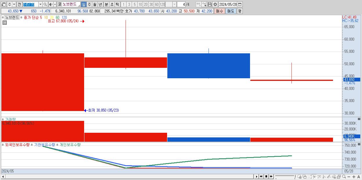 - 노브랜드 (43,650원 ▼ -1.47% , 시총: 3,340억, 거래량: 6,340,101, 거래대금:2,953억)