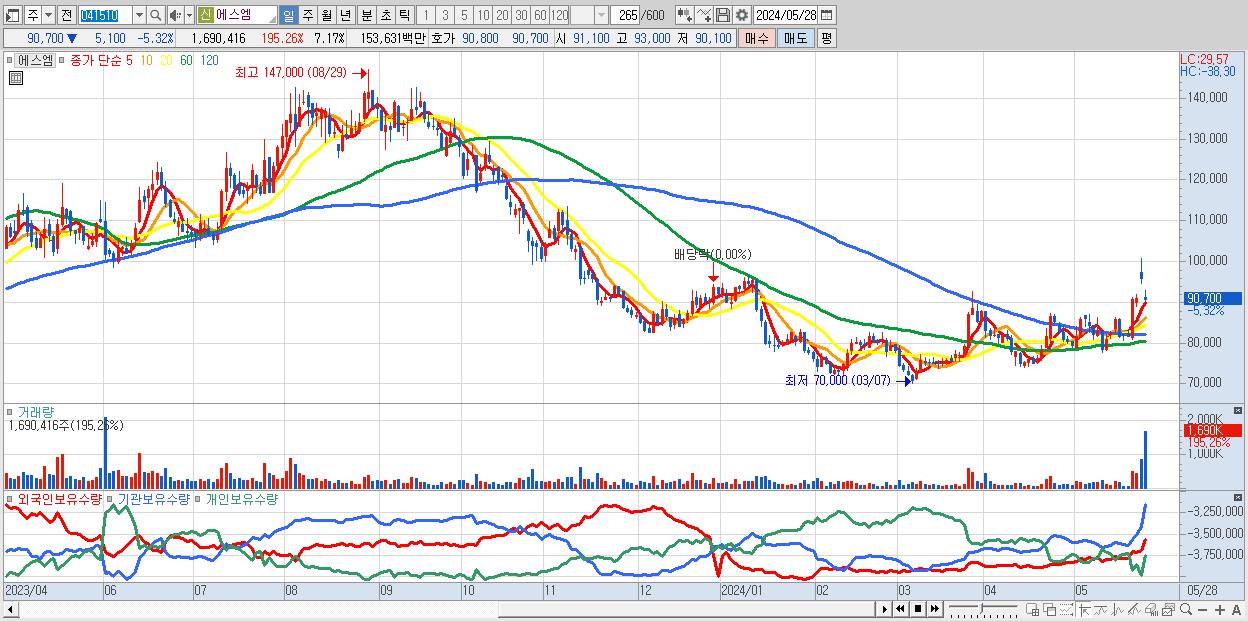 - 에스엠 (90,700원 ▼ -5.32% , 시총: 21,396억, 거래량: 1,690,416, 거래대금:1,536억)