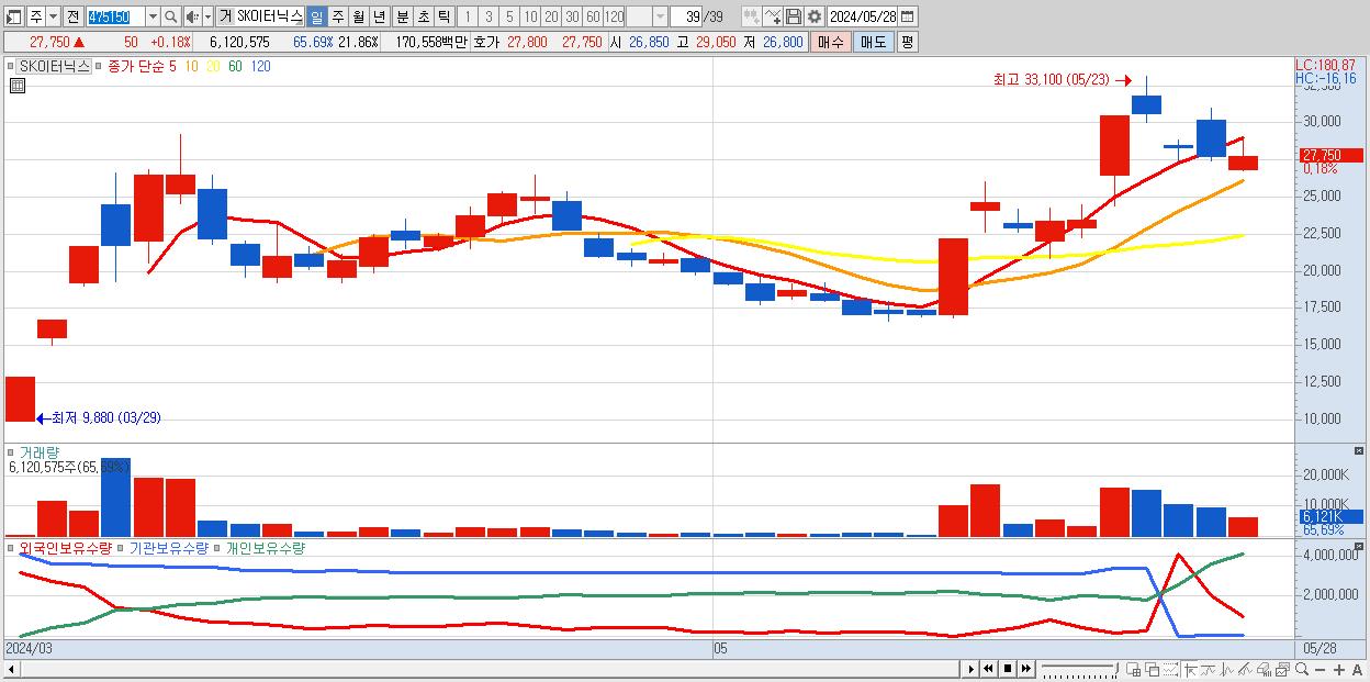 - SK이터닉스 (27,750원 ▲ 0.18% , 시총: 7,769억, 거래량: 6,120,575, 거래대금:1,706억)