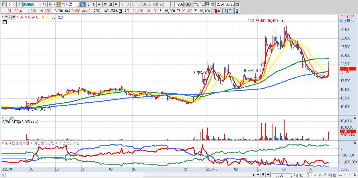 - 엑시콘 (21,100원 ▲ 9.33% , 시총: 2,289억, 거래량: 6,701,047, 거래대금:1,453억)