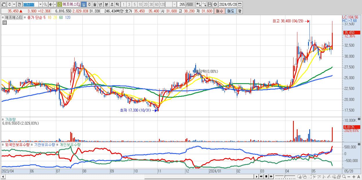 - 에프에스티 (35,450원 ▲ 12.36% , 시총: 7,713억, 거래량: 6,816,550, 거래대금:2,464억)