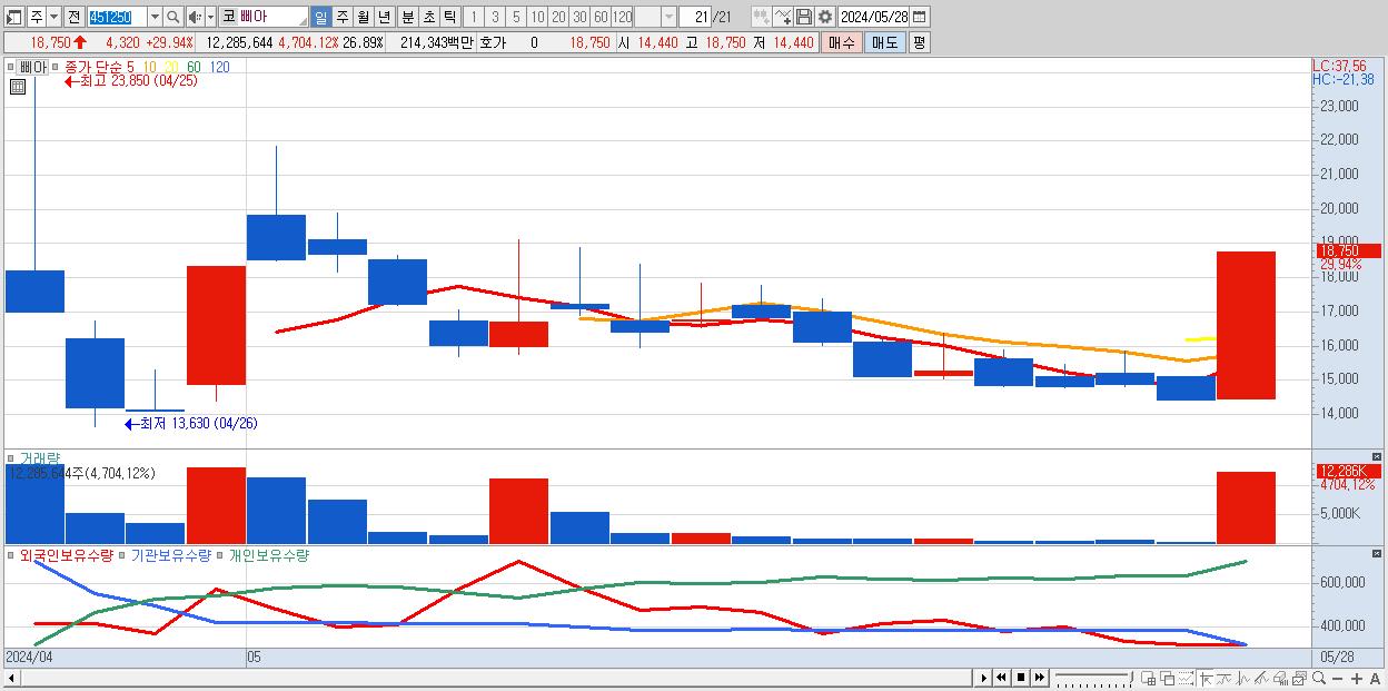 - 삐아 (18,750원 ▲ 29.94% , 시총: 1,815억, 거래량: 12,285,644, 거래대금:2,143억)