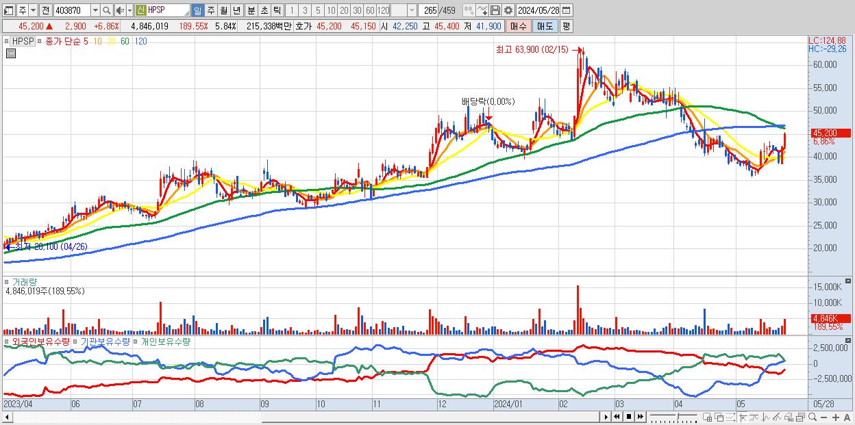 - HPSP (45,200원 ▲ 6.86% , 시총: 37,486억, 거래량: 4,846,019, 거래대금:2,153억)