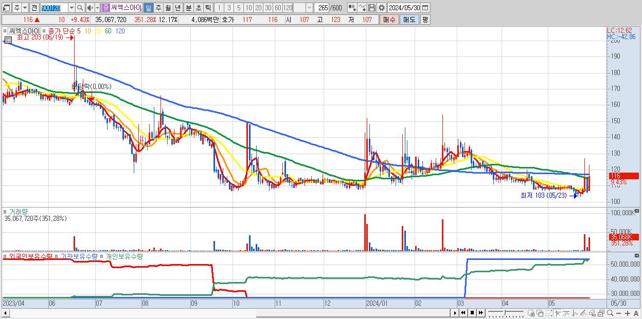 - 씨엑스아이 (116원 ▲ 9.43% , 시총: 334억, 거래량: 35,067,720, 거래대금:41억)