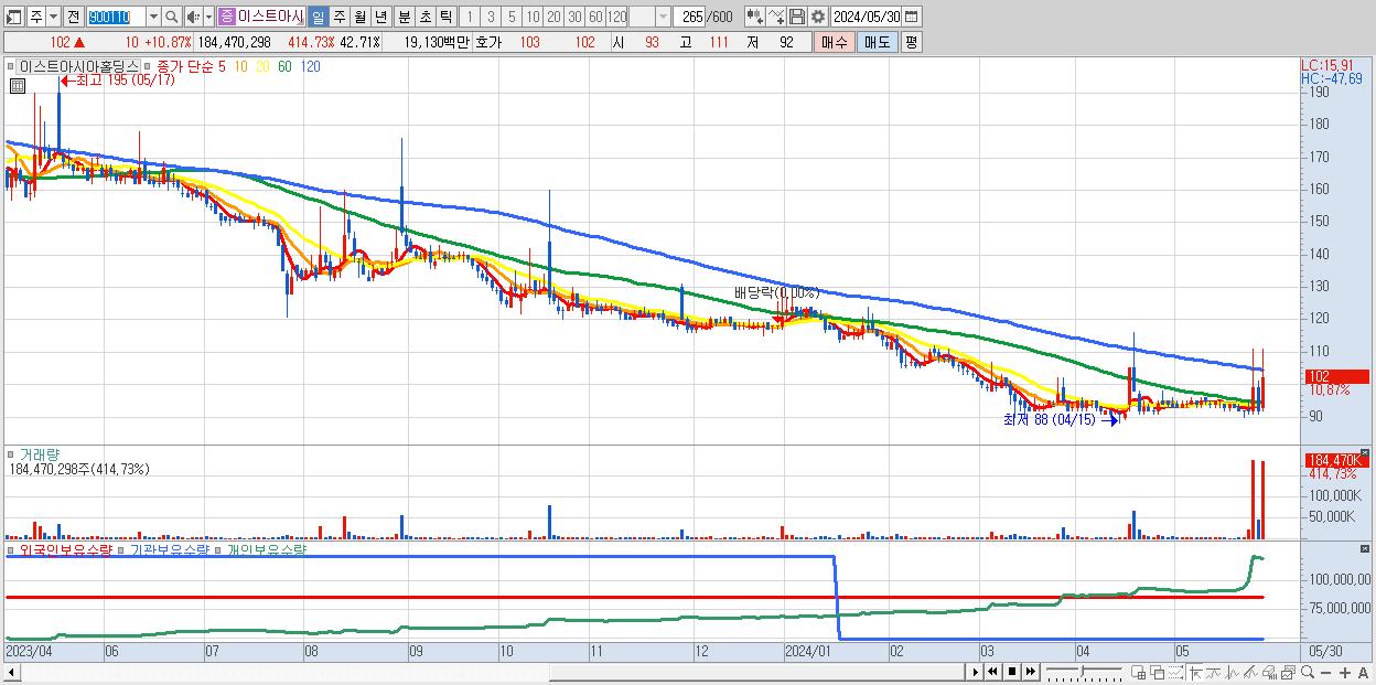 - 이스트아시아홀딩스 (102원 ▲ 10.87% , 시총: 441억, 거래량: 184,470,298, 거래대금:191억)