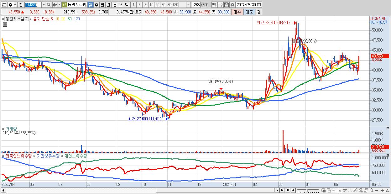 - 동원시스템즈 (43,550원 ▲ 8.88% , 시총: 12,626억, 거래량: 219,591, 거래대금:94억)