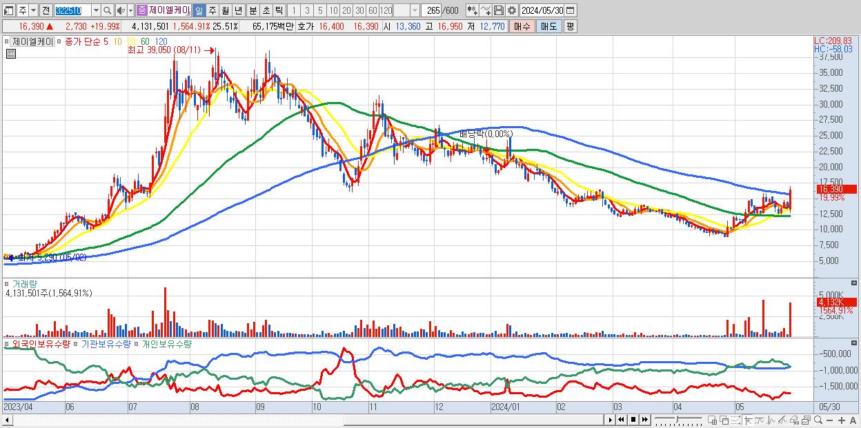 - 제이엘케이 (16,390원 ▲ 19.99% , 시총: 2,654억, 거래량: 4,131,501, 거래대금:652억)