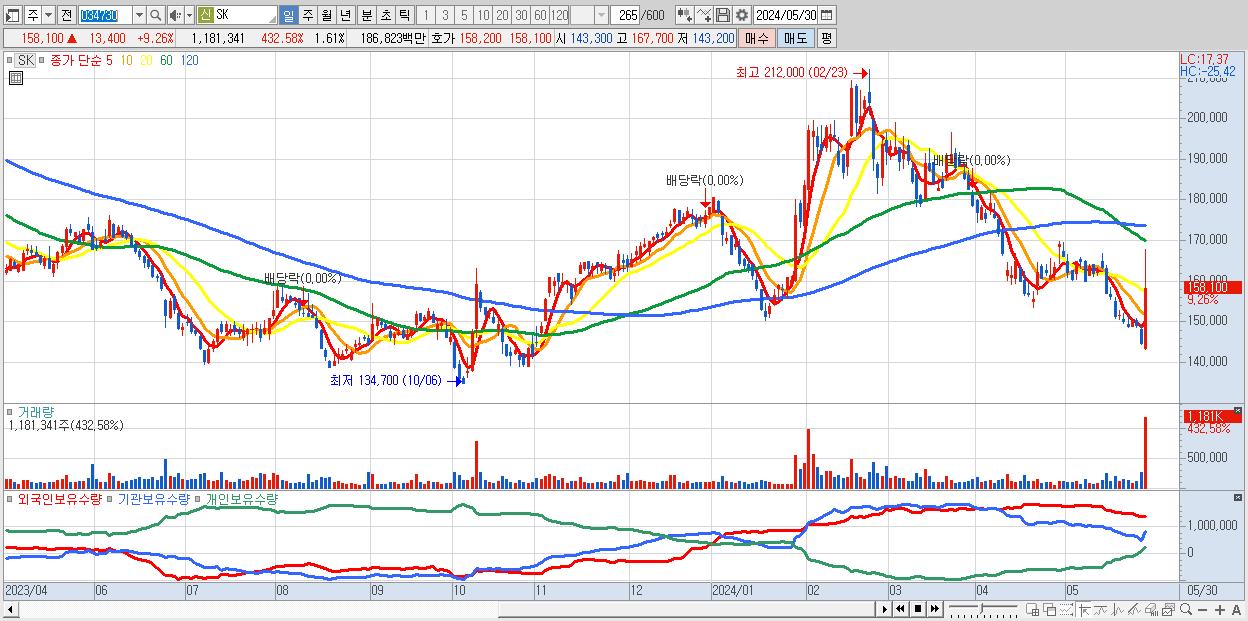 - SK (158,100원 ▲ 9.26% , 시총: 115,727억, 거래량: 1,181,341, 거래대금:1,868억)