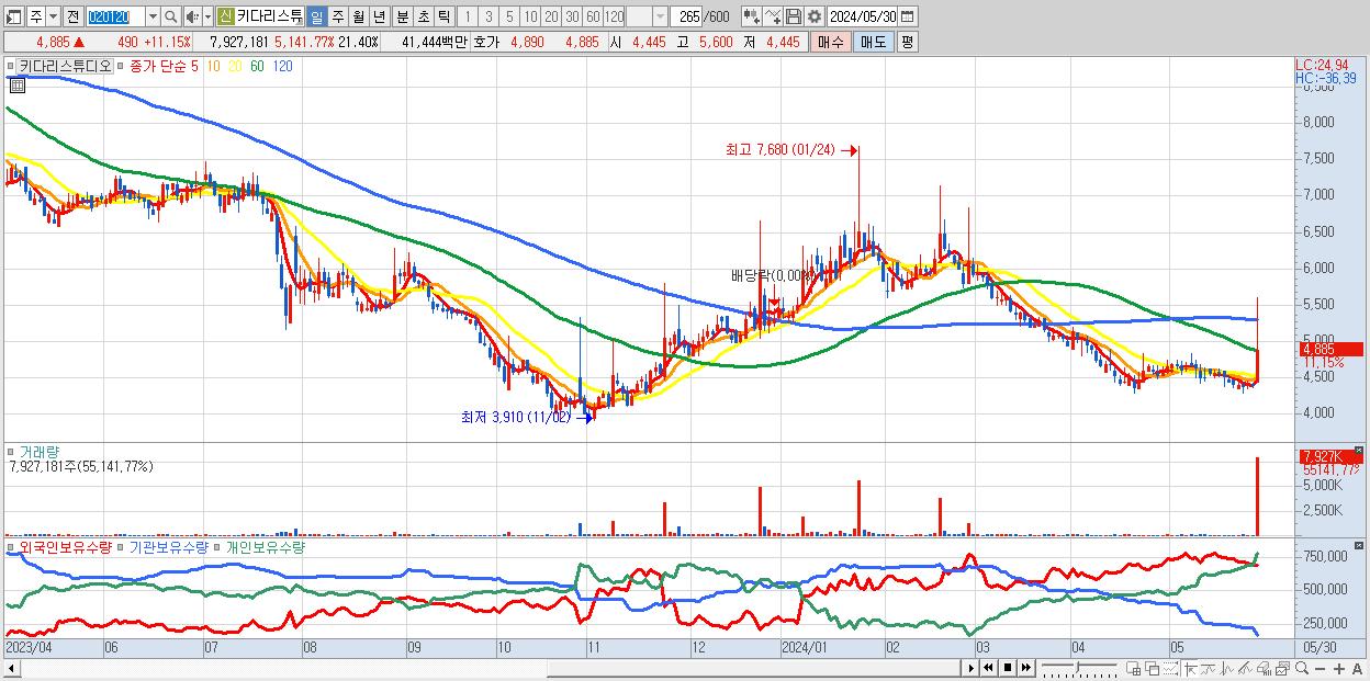 - 키다리스튜디오 (4,885원 ▲ 11.15% , 시총: 1,810억, 거래량: 7,927,181, 거래대금:414억)