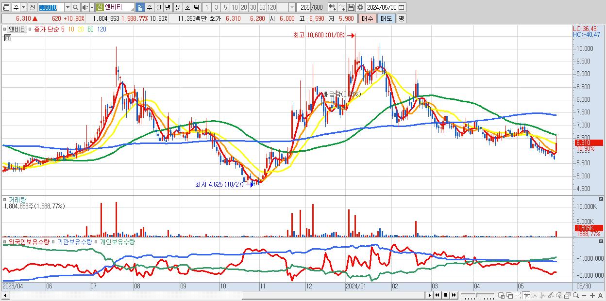 - 엔비티 (6,310원 ▲ 10.9% , 시총: 1,071억, 거래량: 1,804,853, 거래대금:114억)