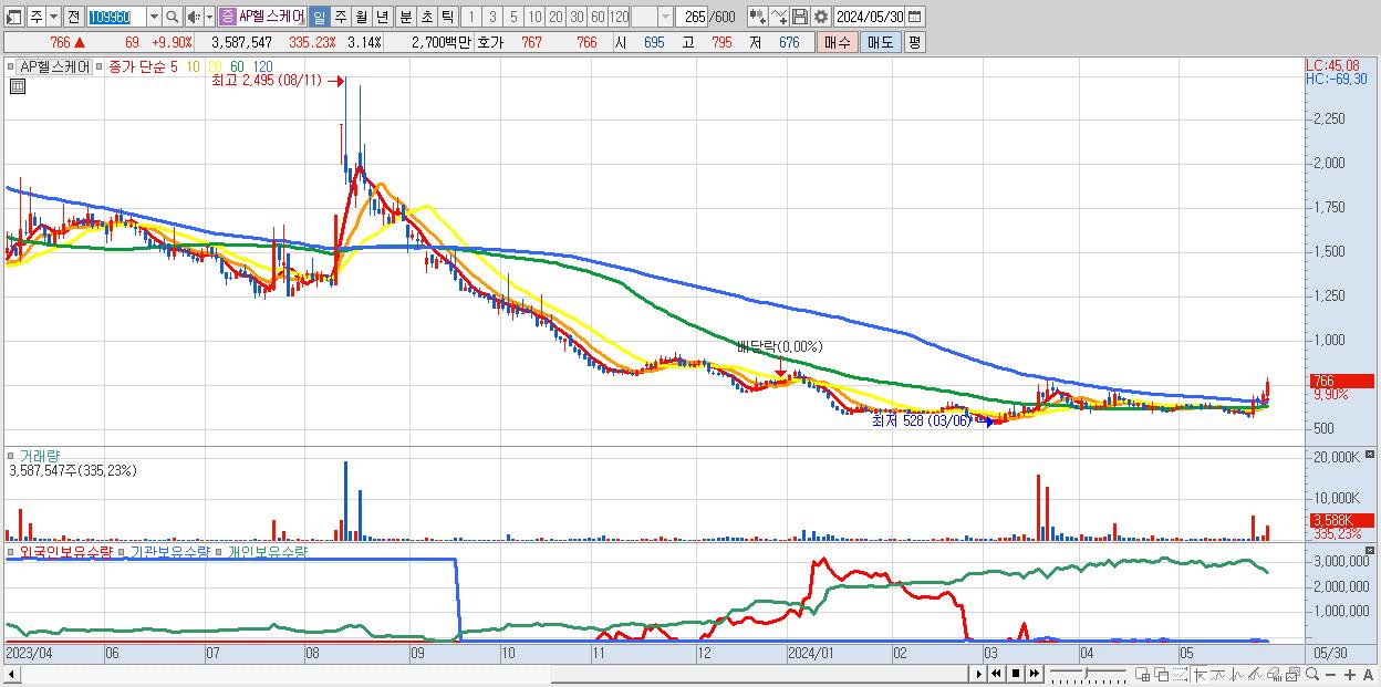 - AP헬스케어 (766원 ▲ 9.9% , 시총: 874억, 거래량: 3,587,547, 거래대금:27억)