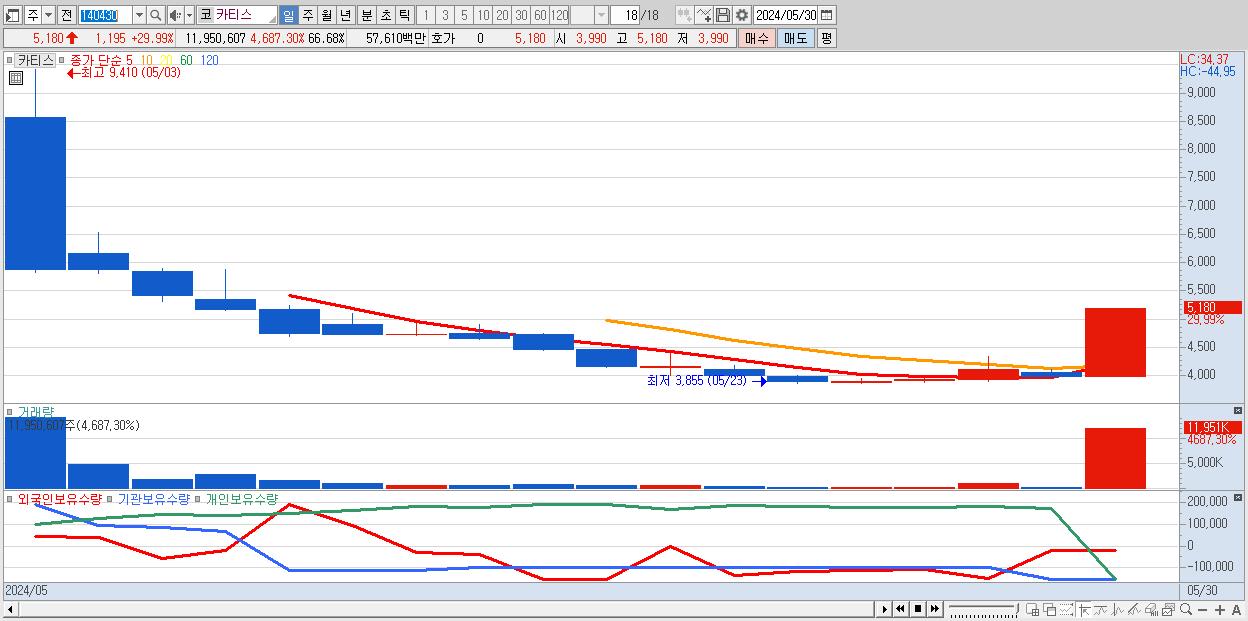 - 카티스 (5,180원 ▲ 29.99% , 시총: 928억, 거래량: 11,950,607, 거래대금:576억)