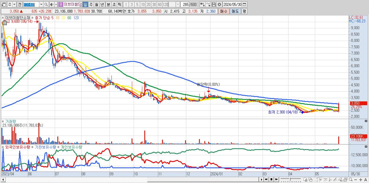 - 이브이첨단소재 (3,050원 ▲ 26.29% , 시총: 1,817억, 거래량: 23,106,088, 거래대금:681억)