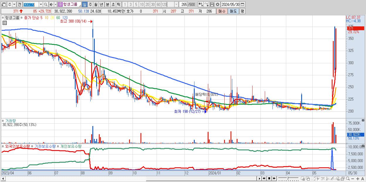 - 헝셩그룹 (371원 ▲ 29.72% , 시총: 466억, 거래량: 30,922,390, 거래대금:105억)