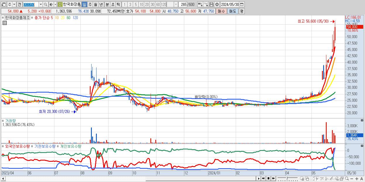 - 한국화장품제조 (54,000원 ▲ 10.66% , 시총: 2,447억, 거래량: 1,363,596, 거래대금:725억)