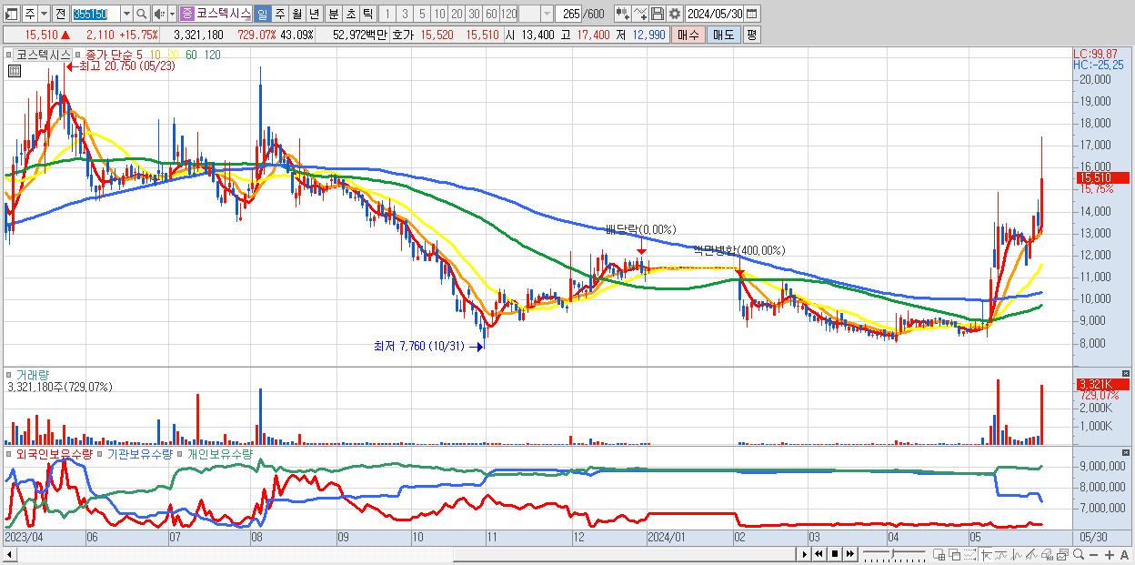 - 코스텍시스 (15,510원 ▲ 15.75% , 시총: 1,195억, 거래량: 3,321,180, 거래대금:530억)