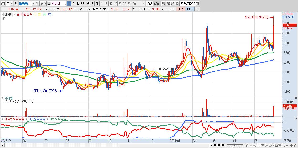 - 엔피디 (3,165원 ▲ 17.66% , 시총: 682억, 거래량: 7,141,107, 거래대금:226억)