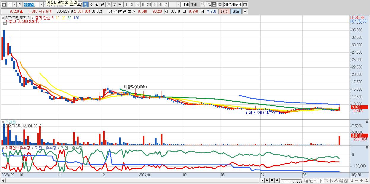- STX그린로지스 (9,020원 ▲ 12.61% , 시총: 647억, 거래량: 3,642,719, 거래대금:344억)
