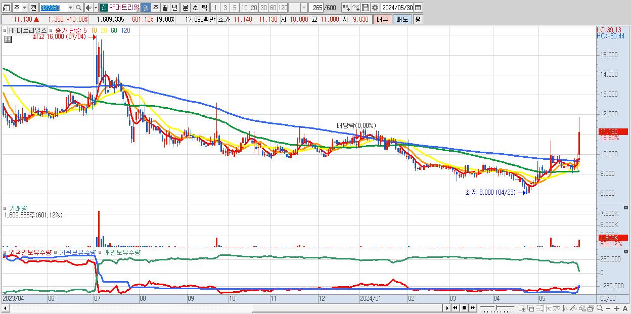 - RF머트리얼즈 (11,130원 ▲ 13.8% , 시총: 939억, 거래량: 1,609,335, 거래대금:179억)