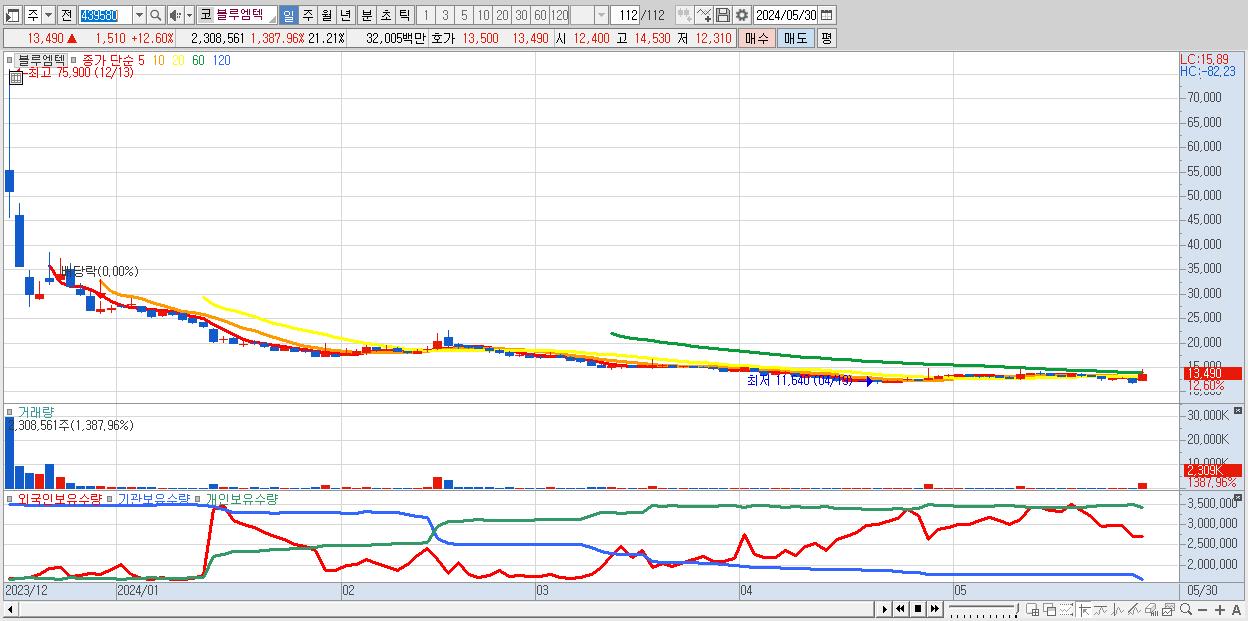 - 블루엠텍 (13,490원 ▲ 12.6% , 시총: 1,468억, 거래량: 2,308,561, 거래대금:320억)