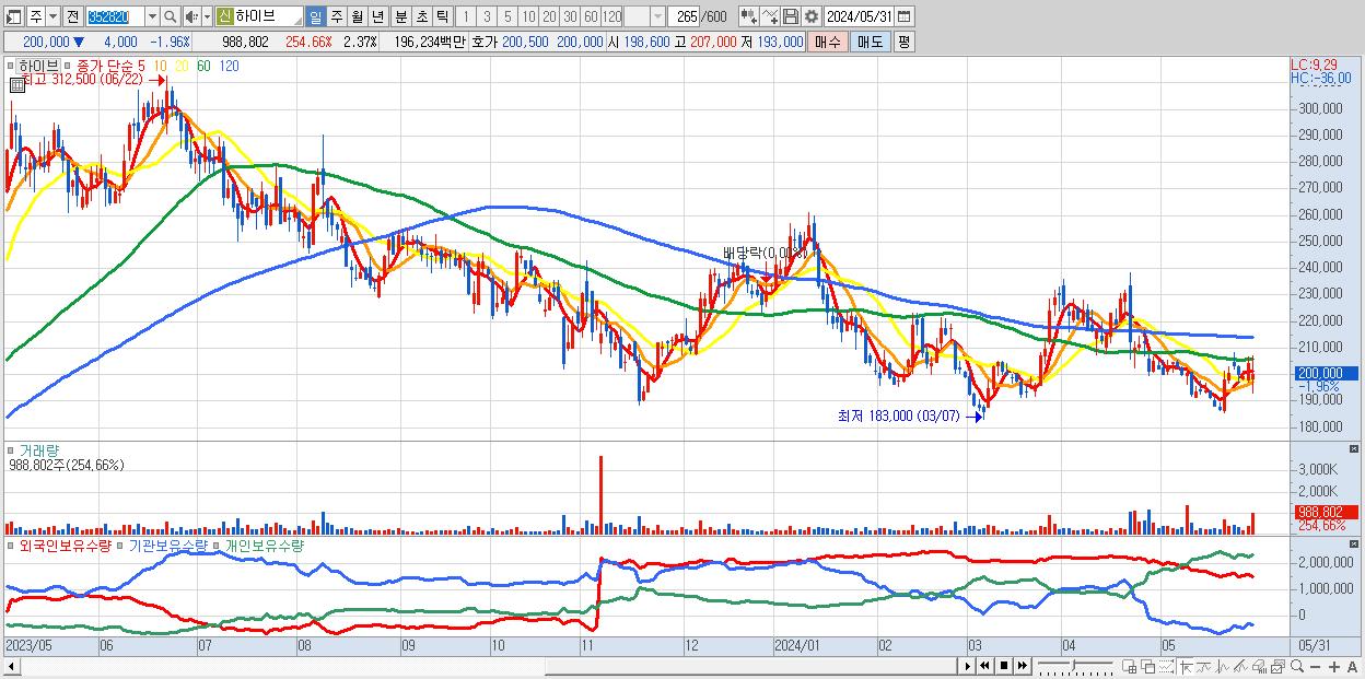 - 하이브 (200,000원 ▼ -1.96% , 시총: 83,304억, 거래량: 988,802, 거래대금:1,962억)