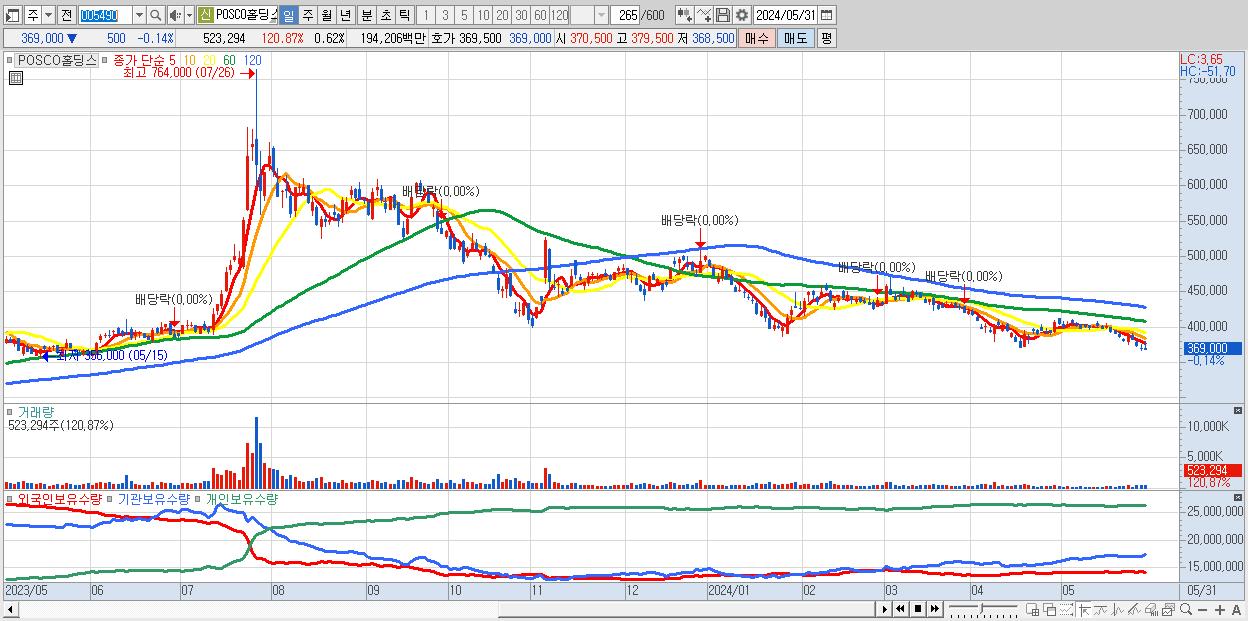 - POSCO홀딩스 (369,000원 ▼ -0.14% , 시총: 312,068억, 거래량: 523,294, 거래대금:1,942억)