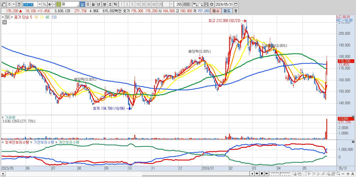 - SK (176,200원 ▲ 11.45% , 시총: 128,975억, 거래량: 3,630,128, 거래대금:6,150억)