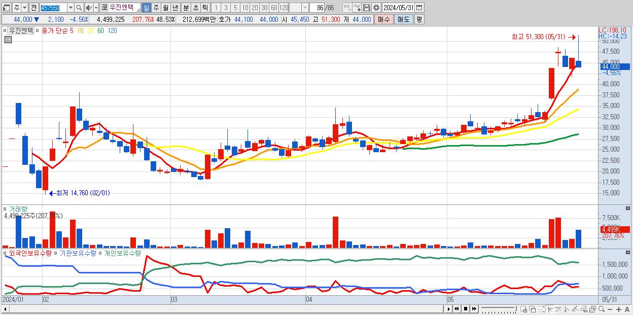 - 우진엔텍 (44,000원 ▼ -4.56% , 시총: 4,079억, 거래량: 4,499,225, 거래대금:2,127억)