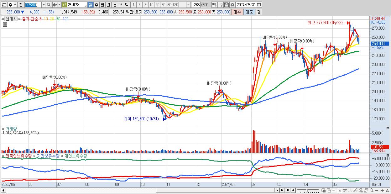 - 현대차 (253,000원 ▼ -1.56% , 시총: 529,823억, 거래량: 1,014,549, 거래대금:2,585억)